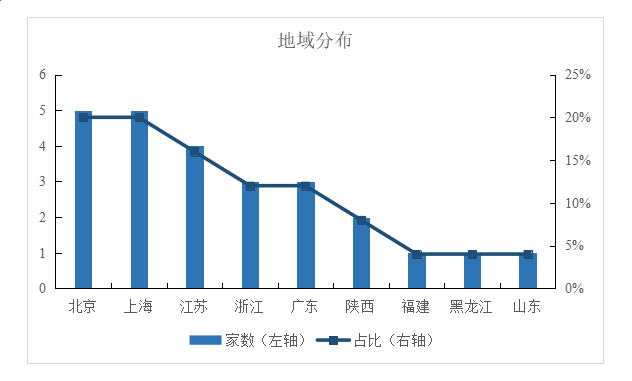 从企业所属地域分布来看,北京、上海各5家,市场占比均达20%,排名并列第一;紧随其后的江苏4家,市场占比16%,排名第三。