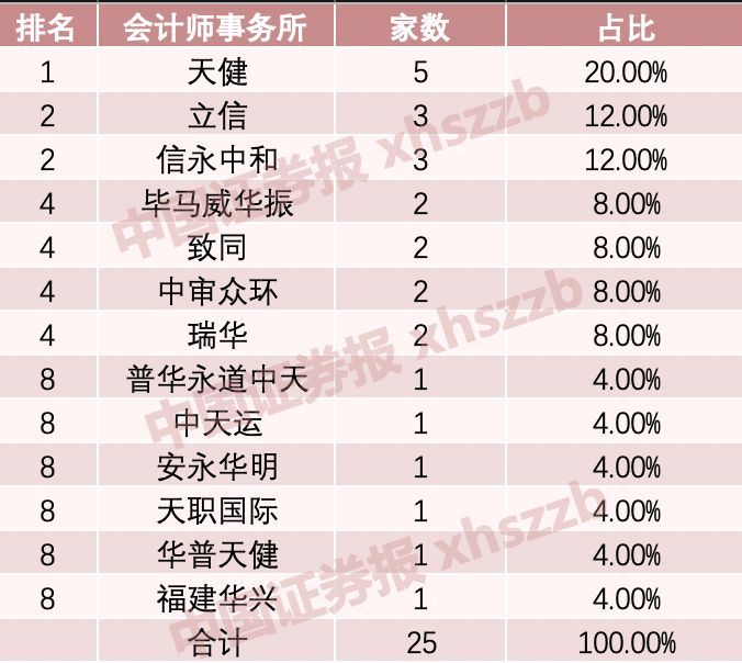 从会计师事务所分布来看,天健5家,市场占比达20%,独占鳌头;立信和信永中和各3家,市场占比均为12%,排名并列第二。
