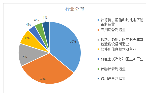 从行业分布来看,计算机、通信和其他电子设备制造业9家,市场占比达36%,排名第一;紧随其后的专用设备制造业8家,市场占比32%,排名第二。