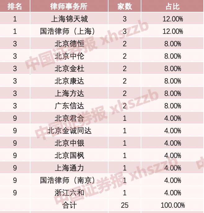 从律师事务所分布来看,上海锦天城和国浩律师(上海)各有3家,市场占比均为12%,排名并列第一;紧随其后的是北京德恒、北京中伦、北京金杜、北京康达、上海方达、广东信达这六家律师事务所,各有2家,市场占比均为8%,排名并列第三。