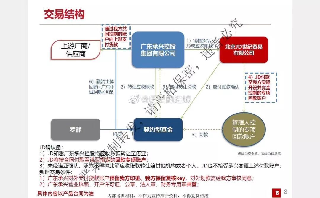 简单的说,就是罗静把承兴国际控股与京东的业务合同,在诺亚公司进行供应链融资;而诺亚将这一基础资产包装为基金产品,销售给投资人。