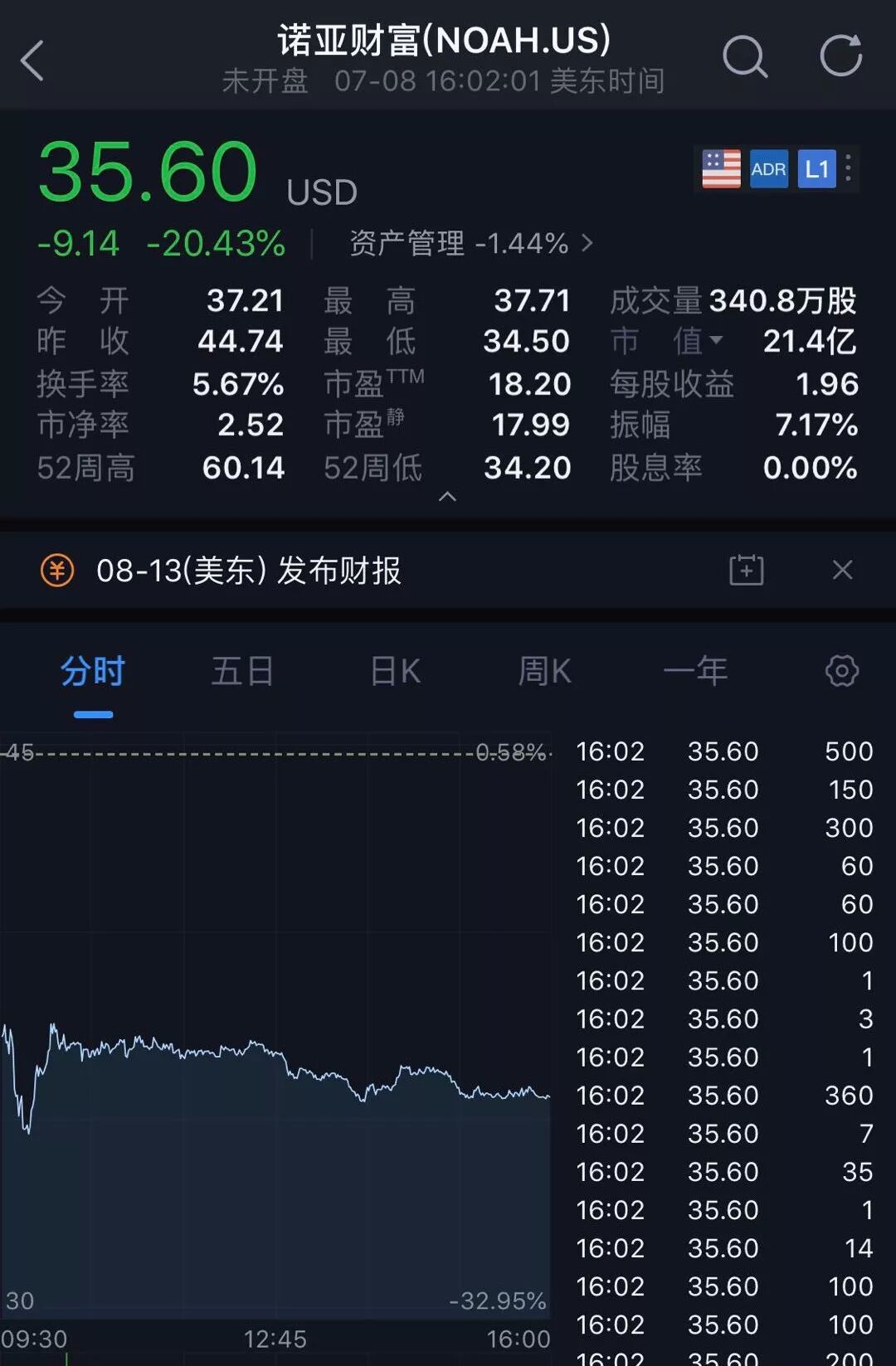 受事件影响,7月8日晚间美股开盘后诺亚财富股价暴跌逾20%,市值损失约5亿美元。当天诺亚财富股价大跌20.43%,以35.6美元收盘。