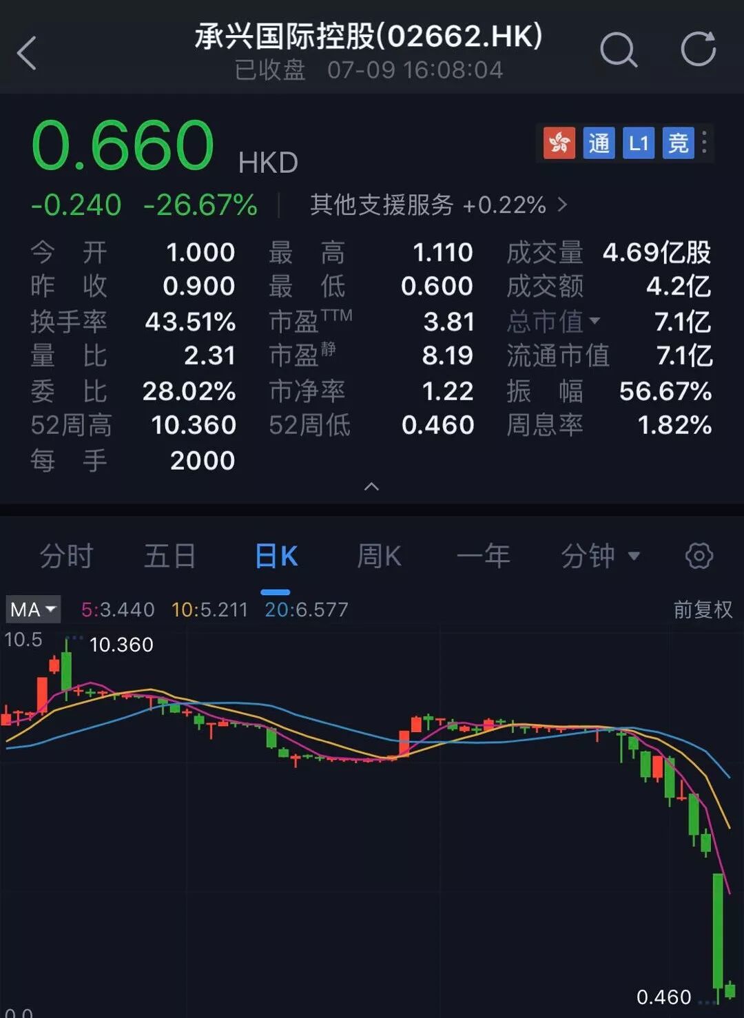 但港股公司——承兴国际控股(2662HK)则继续暴跌,尾盘大跌27%,报0.66港元。而7月8日已经暴跌超过80%,从4港元的开盘价直接跌到0.9港元。