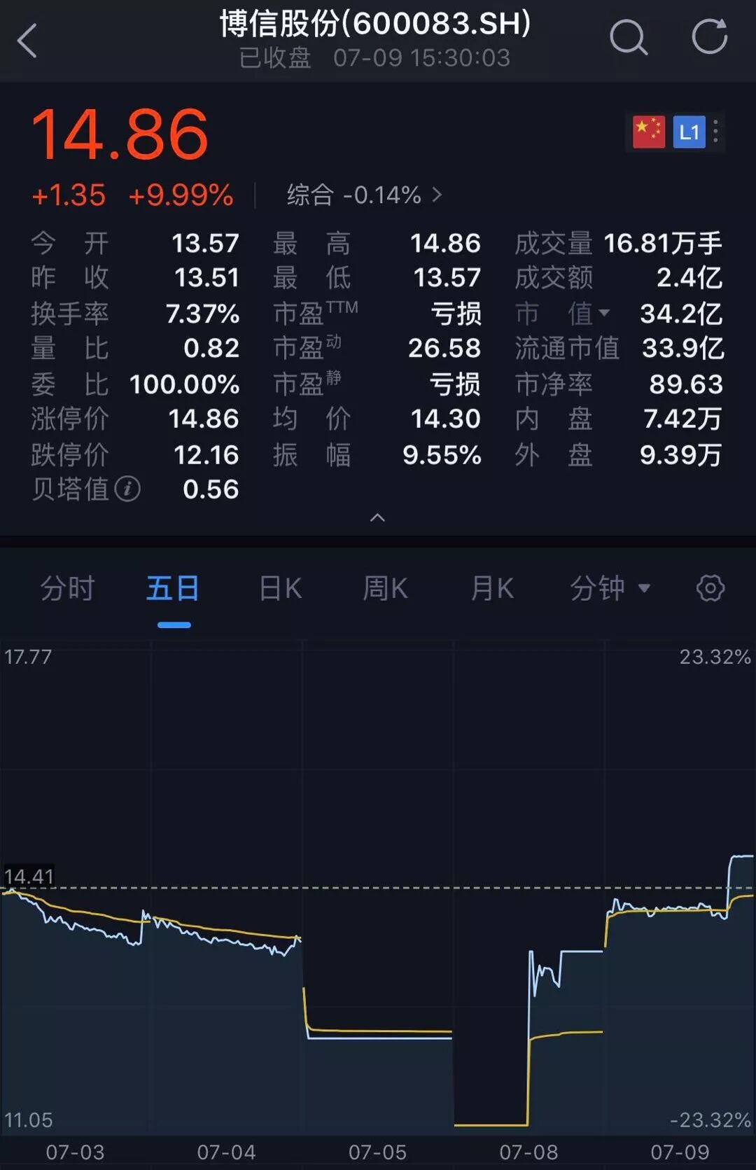 7月9日尾盘,博信股份再度拉升涨停,成交额2.33亿元。而公司股票昨日上演“地天板”。