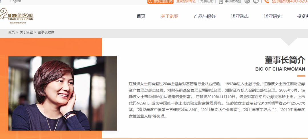 诺亚的董事长叫汪静波,拥有超过20年金融与财富管理行业从业经验。1992年进入金融行业,历任湘财证券资产管理总部总经理,湘财荷银基金管理公司副总经理,湘财证券私人金融总部总经理。