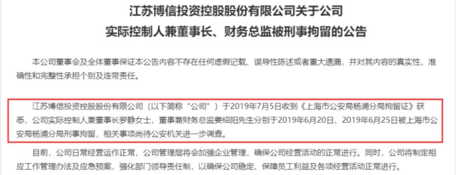 7月5日午间,博信股份公告称,江苏博信投资控股股份有限公司于2019年7月5日收到《上海市公安局杨浦分局拘留证》获悉,公司实际控制人兼董事长罗静女士,董事兼财务总监姜绍阳先生分别于2019年6月20日、2019年6月25日被上海市公安局杨浦分局刑事拘留,相关事项尚待公安机关进一步调查。
