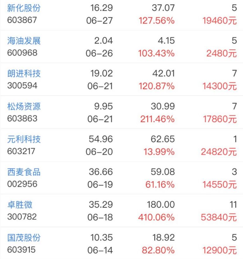 而投资者近1个月能够打中一个新股,收益也非常可观,开板前卖出,收益从2400元到54000元不等。
