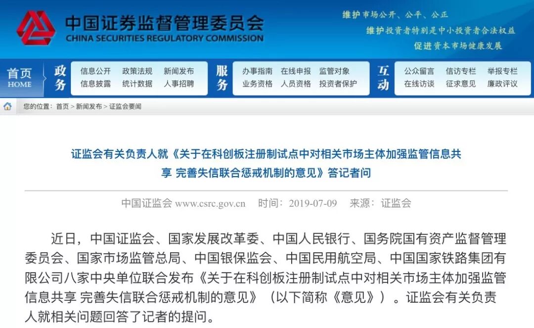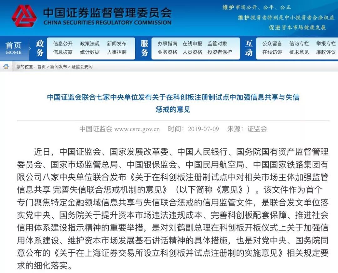 7月9日,证监会官网上披露《关于在科创板注册制试点中对相关市场主体加强监管信息共享完善失信联合惩戒机制的意见》(简称《意见》),该意见由证监会、发改委、央行、国资委、国家市场监管总局、银保监会、民用航空局、国家铁路集团等八部委联合发布。