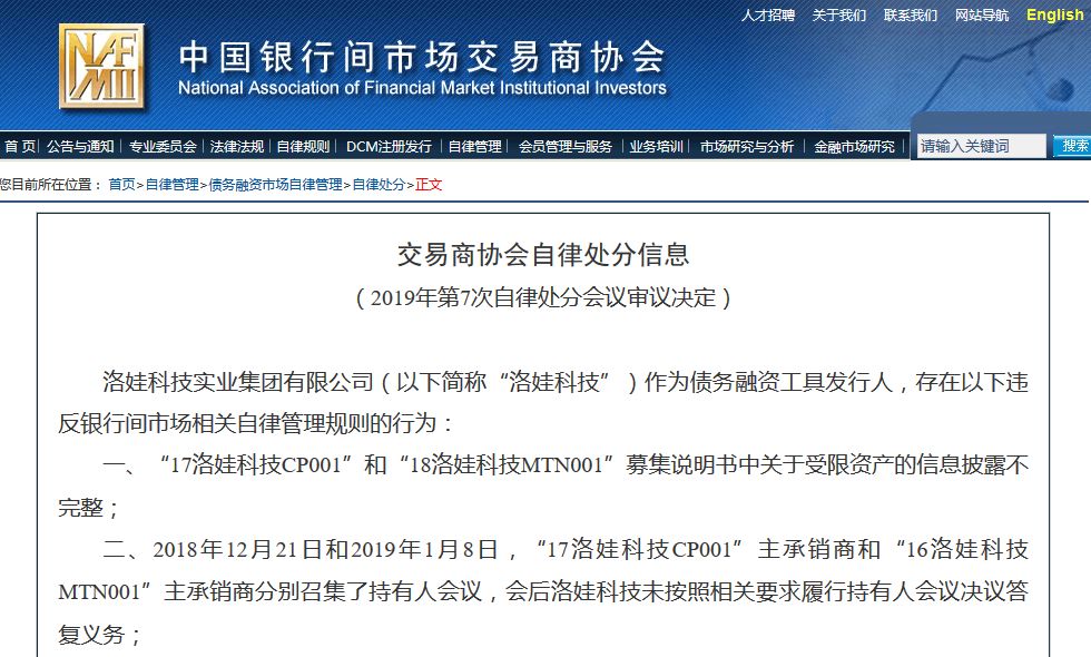 7月8日,交易商协会发布2019年第7次自律处分会议审议决定,根据相关自律规定,对洛娃科技给予公开谴责处分。