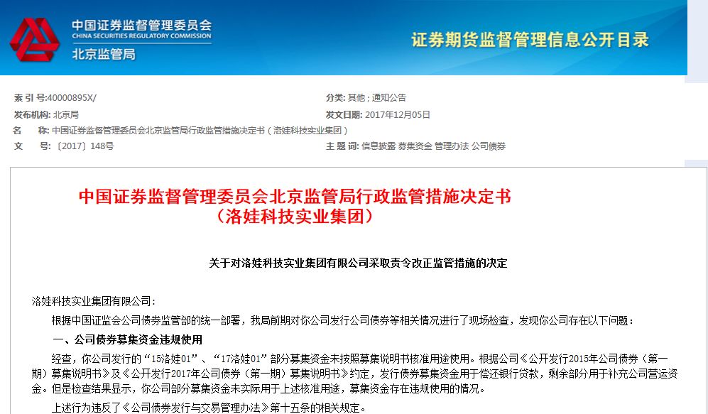 事实上,此次遭遇交易商协会点名并非洛娃科技首次。在债券违约之前,2017年11月,洛娃科技就曾受到北京证监局采取的行政监管措施。