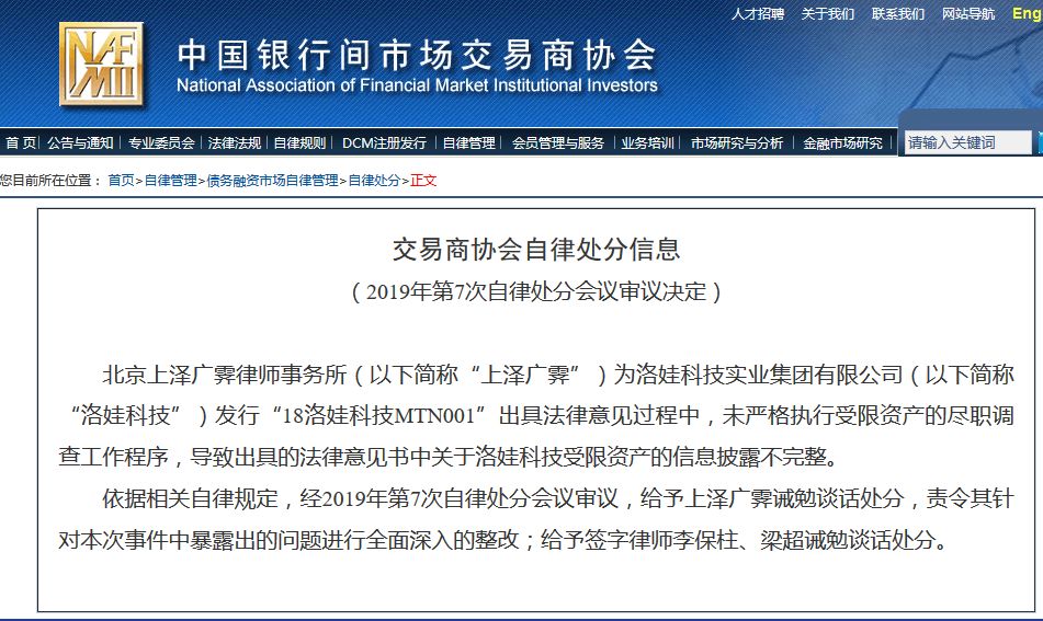 7月8日,交易商协会下发自律处分决定,给予洛娃科技及公司董事长、副总裁公开谴责处分,相关债券的律师事务所及签字律师也给给予训勉谈话。