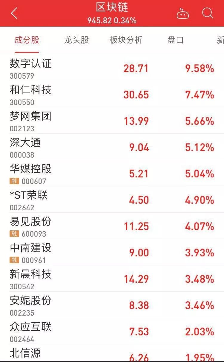 近期A股区块链概念活跃,10日上午,多只区块链概念股集体高开,截至收盘,区块链概念指数微涨0.34%。数字认证、和仁科技、梦网集团、深大通等多只个股涨幅超5%。