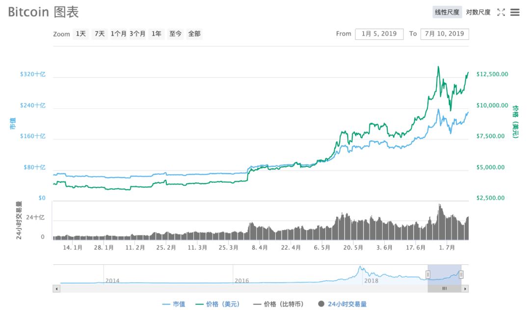 比特币近期以一路飙升的涨势,重回公众视野。7月10日上午,比特币重返13000美元,再创两周内的新高;比特币总市值为2308亿美元,升至全球加密市场总市值的64.8%,这一比例也刷新了自2017年4月以来新高。