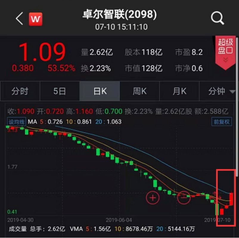 10日早盘,港股卓尔智联(HK:2098)延续8日以来的强势,暴涨超40%,股价重回1港元上方。截至发稿,卓尔智联报1.09港元,总市值128亿港元,连续3日累计升幅158%。此前,卓尔智联股价在1港元以下徘徊已经长达14个交易日。