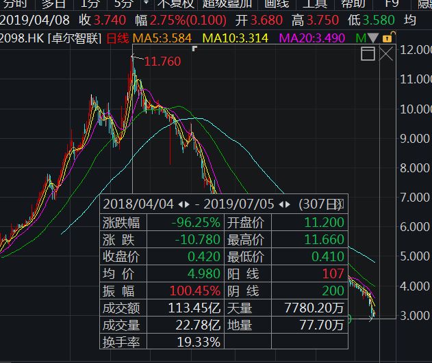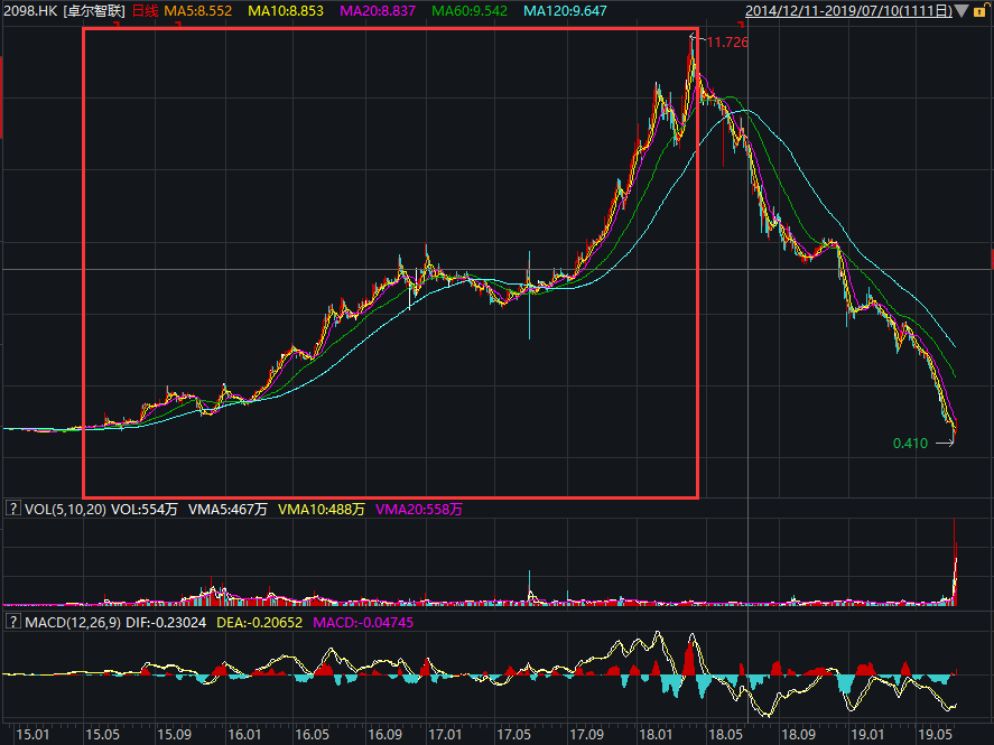 没有人能说得清卓尔智联为什么下跌,但是公司股价自2018年4月的高位11.73港元下跌以来,到近期低点0.41港元,跌幅近96.5%,幅度之大也是让人瞠目。