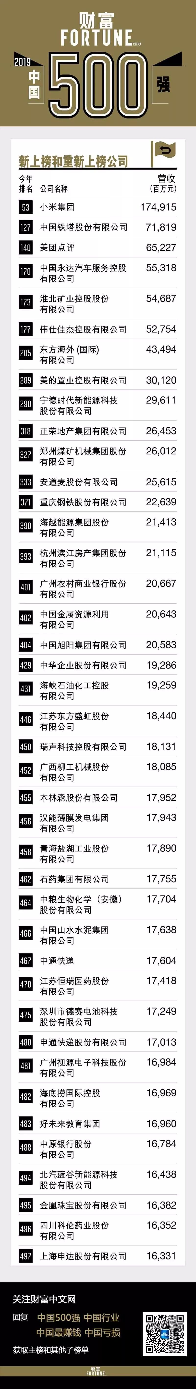今年一共有42家新上榜和重新上榜公司,其中小米集团以1749亿元的总收入排名第53位。美团点评则以652亿元营收排名第140位。