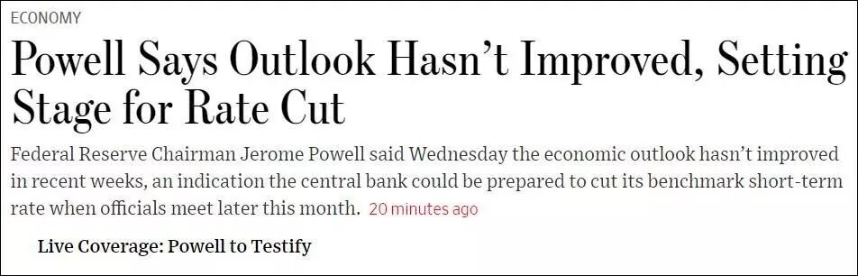 “6月的就业报告没有改变我们的政策展望,6月政策会议以来公布的数据持续令人失望。”鲍威尔表示,经济增长“乱流”重新出现,美联储将酌情采取"适当"行动,以维持美国经济增长。