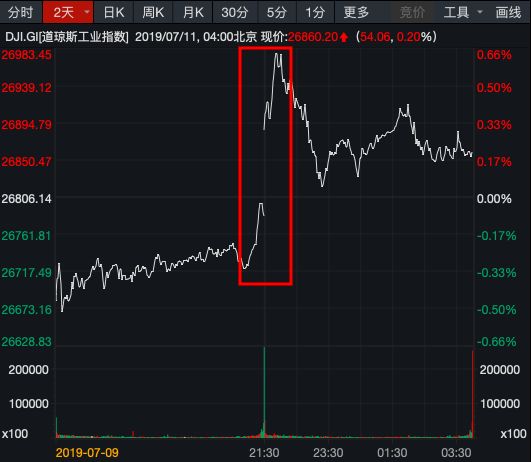 道琼斯指数盘中暴力拉升近300点,收盘报26860.2点,涨幅0.29%。
