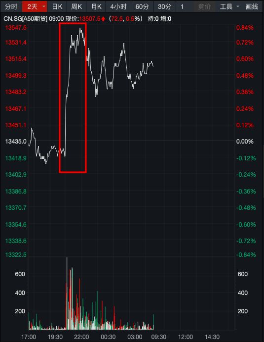 昨夜受该消息刺激,A50期货直线拉升100点,目前涨幅超0.5%。