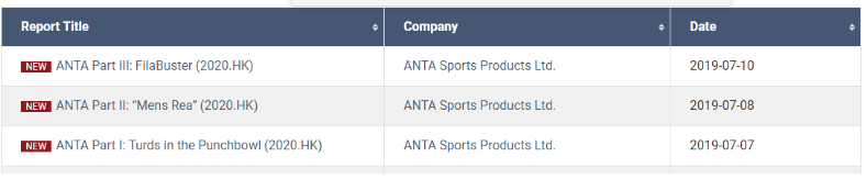 稍早前,7月7日,浑水在其官网发布做空报告,首次质疑安踏利用大量一级经销商操纵财务报表。