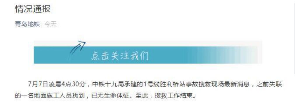 三天后青岛地铁宣布,7月7日凌晨4点30分,中铁十九局承建的1号线胜利桥站事故搜救现场最新消息,之前失联的一名地面施工人员找到,已无生命体征。至此,搜救工作结束。