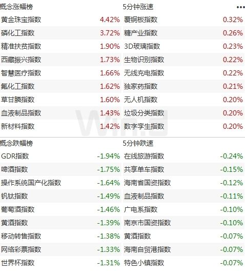 概念板方面,当日黄金珠宝指数、磷化工指数、精准扶贫指数、西藏振兴指数、智慧医疗指数涨幅居前,分别收涨4.42%、3.72%、1.90%、1.73%、1.66%;GDR指数、啤酒指数、操作系统国产化指数、钒钛指数、葡萄酒指数跌幅居前,分别收跌1.94%、1.75%、1.64%、1.49%、1.46%。