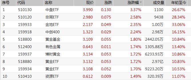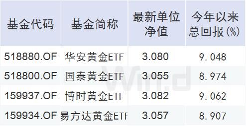 Wind梳理显示,周四易方达黄金ETF(159934)、国泰黄金ETF(518800)、华安黄金ETF(518880)、博时黄金ETF(159937)分别上涨1.70%、1.80%,1.72%和1.72%,涨幅居前。