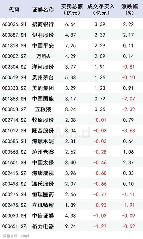 Wind梳理显示,周四沪股通/深股通前十大活跃个股中,招商银行、伊利股份、中国平安净买入居前,分别获净买入3.39亿元、2.39亿元、2.29亿元,中国平安结束连续四日净卖出。