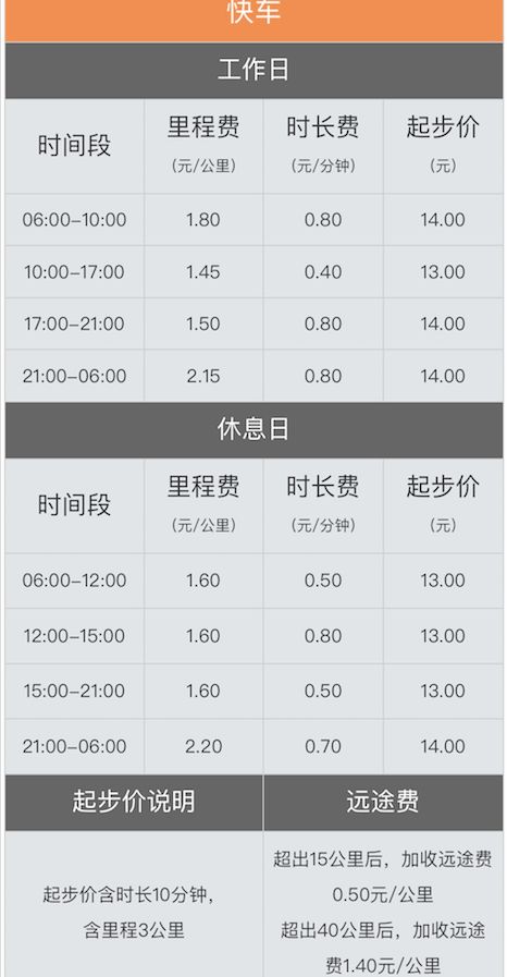 根据《说明》显示,以第一区域快车为例,早高峰时段(6:00-10:00)起步价上涨1元、里程费每公里上涨0.2元,时长费不变;普通时段(10:00-17:00)起步价不变(13元),里程费每公里下调0.15元,时长费每公里下调0.1元;晚高峰时段(17:00-21:00)起步价上涨1元、里程费每公里下调0.1元,时长费不变;夜间到凌晨(21:00-6:00)起步价上涨1元,里程费每公里上涨0.55元,时长费每公里下调0.2元。