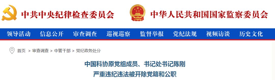 7月11日下午17时,中央纪委国家监委网站发布消息:中国科协原党组成员、书记处书记陈刚严重违纪违法被开除党籍和公职。