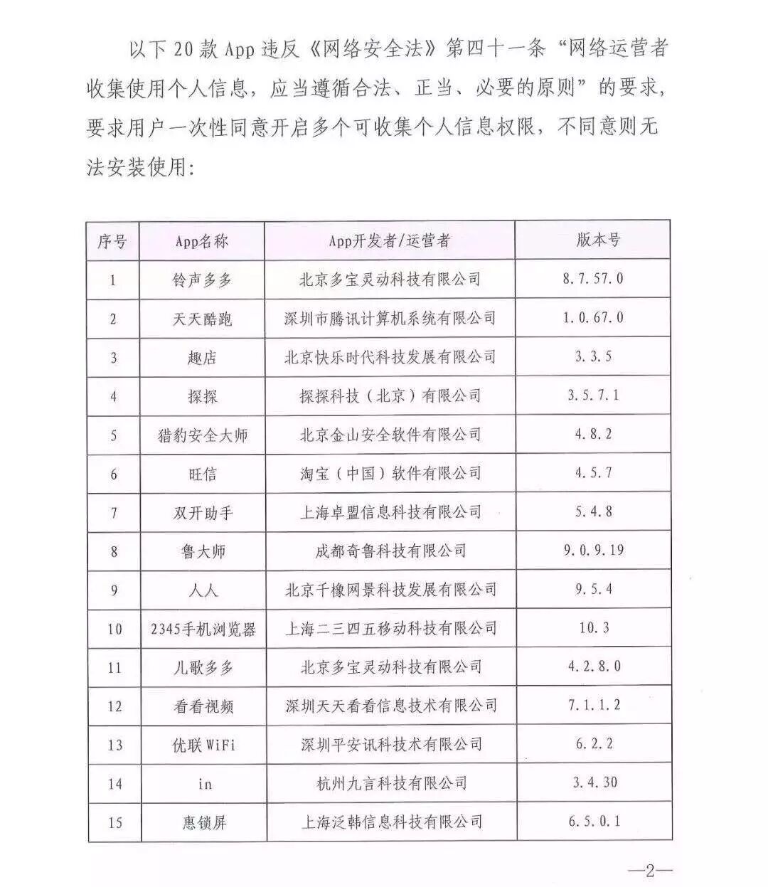 本次《通报》除了“点名”10款存在无隐私政策的APP外,还通报了另外20款存在问题的APP,这些APP违反《网络安全法》第四十一条“网络运营者收集使用个人信息,应当遵循合法、正当、必要的原则”的要求,要求用户一次性同意开启多个可收集个人信息权限,不同意则无法安装使用。