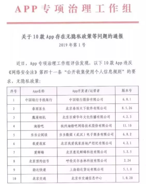 7月12日,工信部官方公众号发布《关于10款APP存在无隐私政策等问题的通报》(下称“《通报》”),包括中国银行手机银行、春雨医生、魔漫相机、淘粉吧、当当云阅读、我爱我家、爱鲜蜂、北京预约挂号、韵达快递、北京交通等10款APP因无隐私政策被通报“点名”。