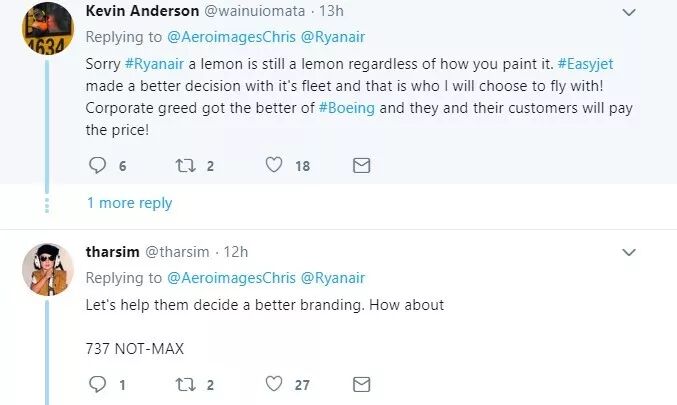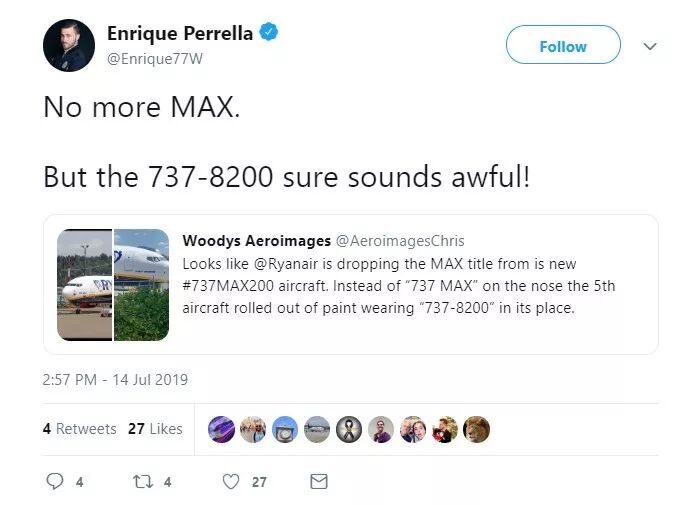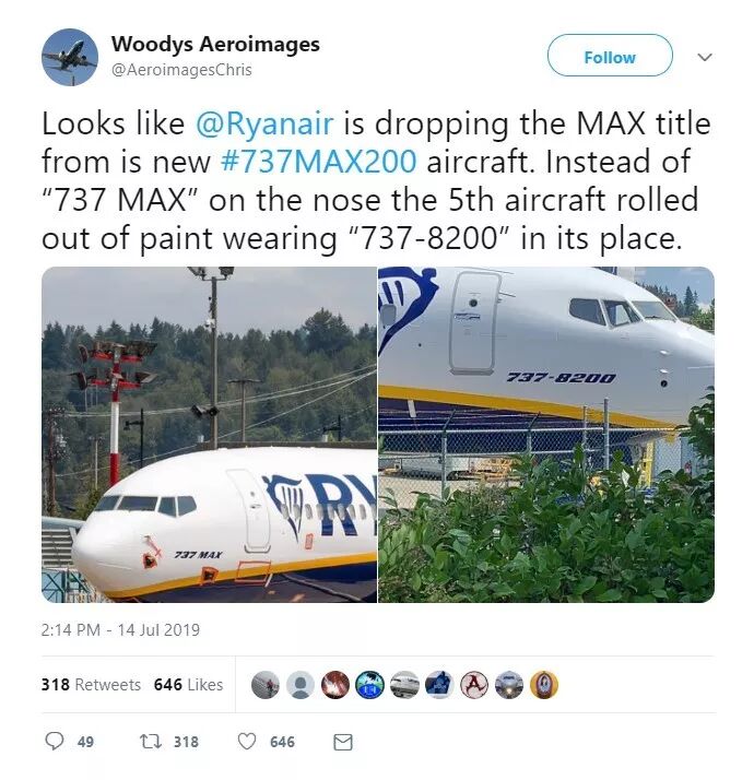 目前尚不清楚这个修改到底是波音公司自己做出的,还是瑞安航空方面提出的。但在一些国外网民看来,不论是谁做出的决定,他们认为“MAX”这个标识已经开始被人遗弃了。