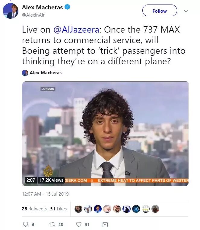 但有国外的航空资讯网站表示,在去年印尼狮航的事故发生后,波音内部便开始将其改称为“737-8-200”。对此,一位名叫亚历克斯·马克拉斯(Alex Macheras)的英国航空分析人士近日在接受卡塔尔半岛电视台采访时称,这可能是波音为了让人们以为这是架不同于出事的737 MAX客机而耍的“套路”。