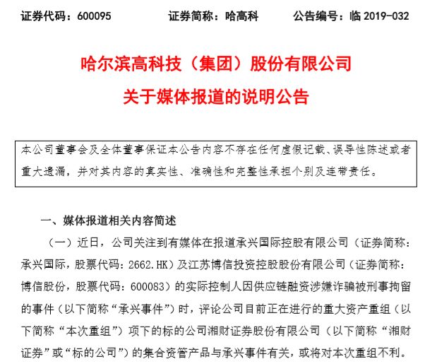 7月12日晚间,哈高科公告称,公司关注到近日有媒体在报道承兴国际控股及博信股份的实际控制人因供应链融资涉嫌诈骗被刑事拘留的事件时,评论公司目前正在进行的重大资产重组项下的标的公司湘财证券的集合资管产品与承兴事件有关,或将对本次重组不利。