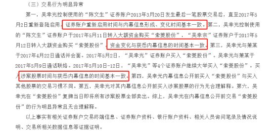 证监局方面认定,在内幕信息正式公开前,吴某控制四个账户进行集中交易,资金变化、账户重启时间与内幕信息的时间基本一致,且吴某本身和知情人董事长弟弟萧某联络频繁,涉案股票时间与获悉内幕信息时间基本一致,可以认定其为内幕交易行为。