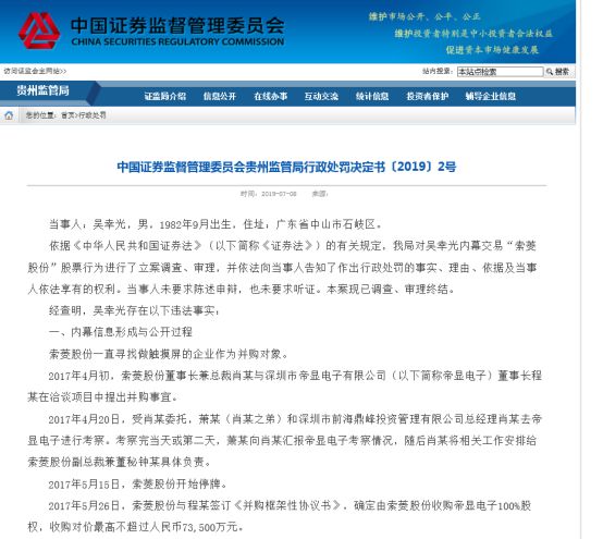 2017年4月20日,*ST索菱董事长兼总裁肖行亦与深圳帝显电子董事长陈某洽谈项目并提出并购意向。受高管哥哥的委托,萧某和另一家投资公司前海鼎峰投资总经理同去调研,并在次日向董事长汇报情况。2017年5月15日,*ST索菱开始停牌。