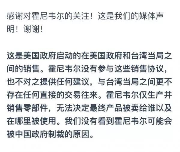 “这是美国政府启动的在美国政府和台湾当局之间的销售。霍尼韦尔没有参与这些销售协议,也不对之提供任何建议,与台湾当局之间更不存在任何直接的交易往来。霍尼韦尔仅生产并销售零部件,无法决定最终产品被卖给谁以及在哪里被使用。我们没有看到霍尼韦尔可能会被中国政府制裁的原因。”