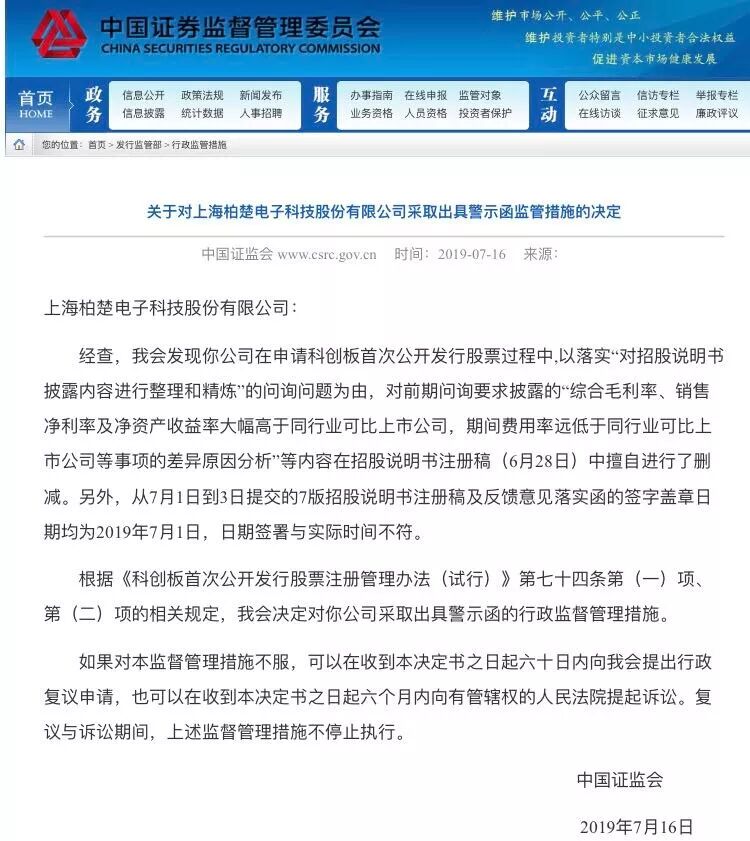 7月16日晚间,证监会网站上公布《关于对中信证券股份有限公司采取出具警示函监管措施的决定》,因其在保荐上海柏楚电子科技股份有限公司(简称“柏楚电子”)科创板首次公开发行股票申请过程中,以落实“对招股书披露内容进行整理和精炼”的问询问题为由,对前期问询要求披露的“综合毛利率、销售净利率及净资产收益率大幅高于同行业可比上市公司,期间费用率远低于同行业可比上市公司等事项的差异原因分析”等内容在招股说明书注册稿(6月28日)中擅自进行了删减。
