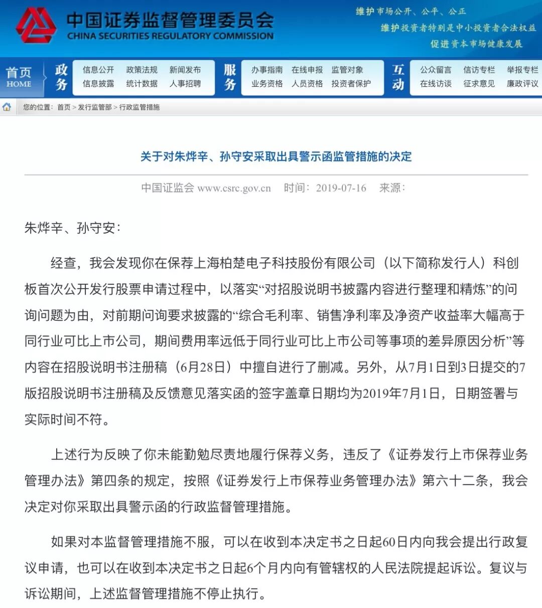 就在中信证券收到罚单的同时,中信证券保荐代表人朱烨辛、孙守安,以及拟上市公司柏楚电子,也收到了关于此事的警示函。