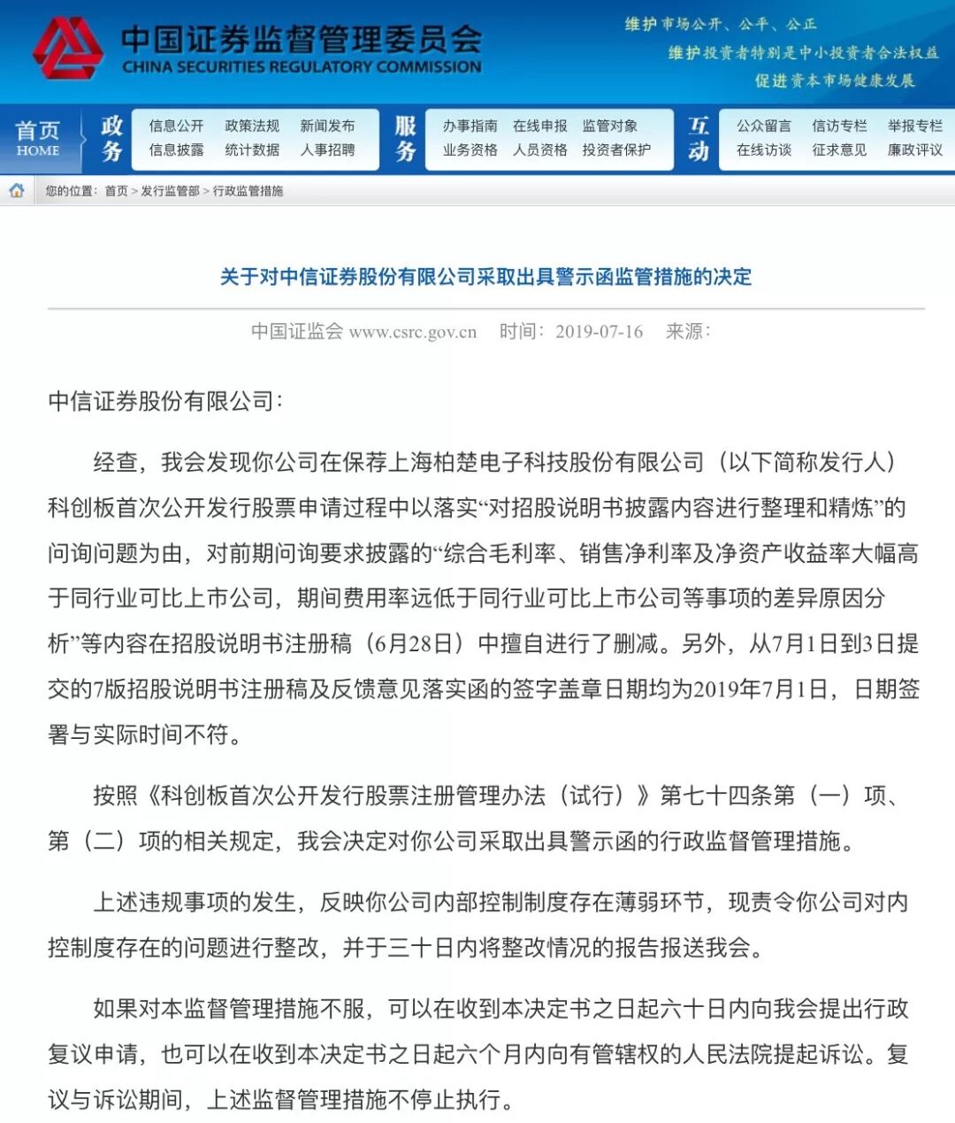 7月16日晚间,证监会网站上连发三份警示函,分别对中信证券及其两名保荐代表人,科创板拟上市公司柏楚电子进行处罚。这是继中金公司获科创板第一单警示函之后,又一家保荐机构获监管罚单。