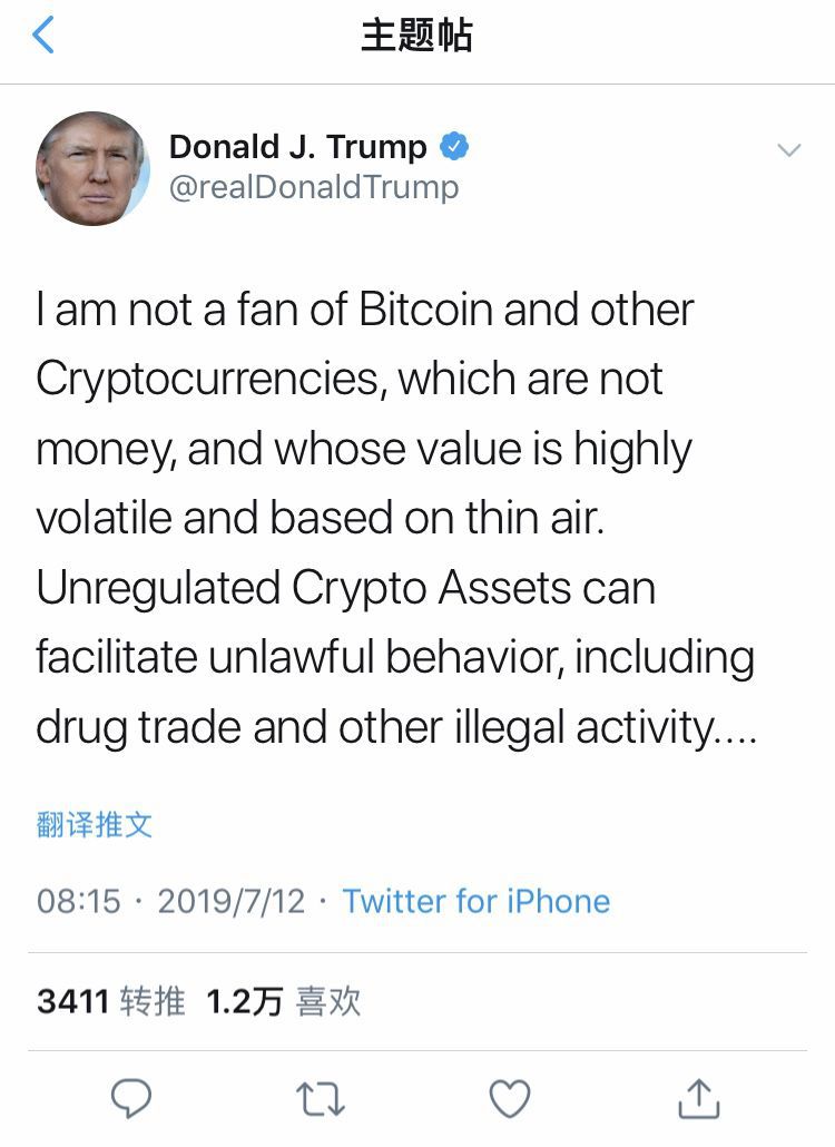 隔日,美国总统特朗普也突然连发数推,表示自己不是比特币的“粉丝”,“它们不是货币,其价值波动剧烈,且根基薄弱”,并提到Facebook 需要为其加密货币申请银行执照。