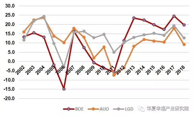 中国大陆LCD产业负重前行,通过十数年的追赶,终于做到了全球领先。涌现了京东方、华星光电、天马等一批全球知名企业。图4中可以看出,京东方2012年前毛利率长期低于友达、LGD等面板大厂;但从2012年开始,京东方实现了毛利率反超并长期保持优势竞争力。