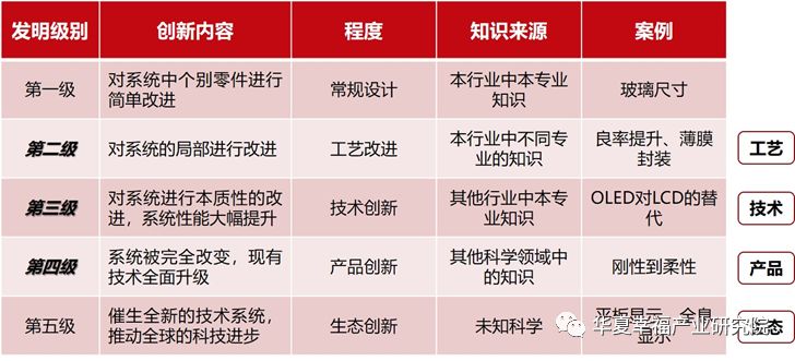 当前显示终端产品开始从“刚性”迈入“柔性”时代,新的产品创新周期即将开启。从创新层级的角度进行分析会发现,当前显示领域的创新集中在二至四级,主要是在原有系统上进行改进。其中,从刚性屏逐渐过渡到可折叠,进而到最终的柔性显示产品,属于第四层级的产品创新。沿着这个路径发展下去,现有技术体系将得到全面升级,现有供应链体系也将迎来巨大变革。