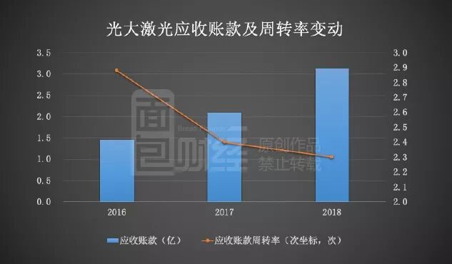 截止2018年末,公司应收票据约7354.39万元,同比增长138%;同时应收账款亦走高,2018年末账面金额约3.14亿,同比增长49.75%,较期初翻了一倍有余。另一方面,公司应收账款周转率持续走低,至2018年降至约2.3(约合156天),较2017年下降约0.1(增加约6天),较2016年下降约0.58(增加约31天)。