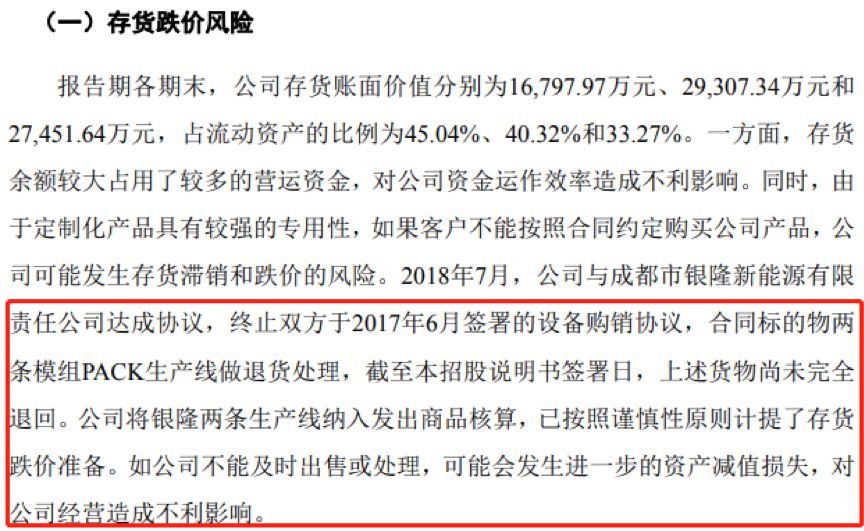申报稿显示2018年8月,公司与成都银隆的设备购销协议终止,合同标的物两条模组PACK生产线做退货处理。这不仅对公司的流动资金产生一定的不利影响,此外公司还于报告期内对其计提存货跌价准备约600万元。