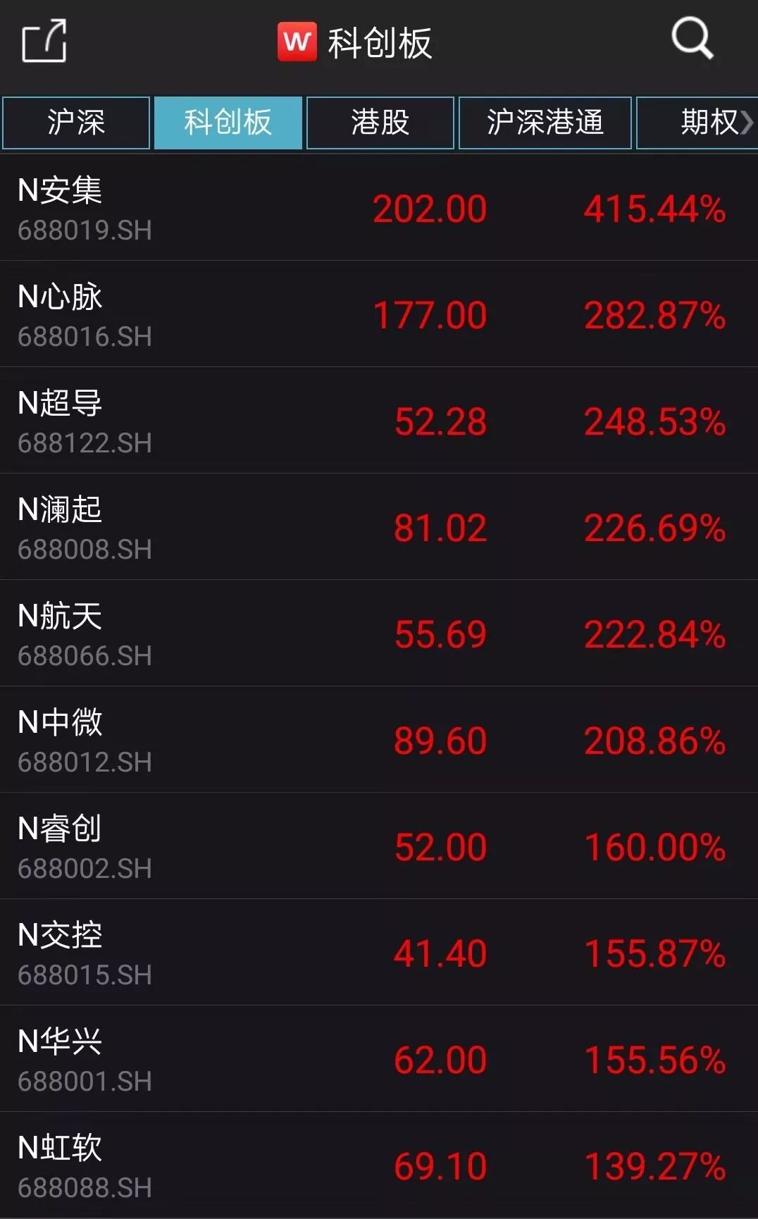 截至午间收盘,科创板25只股票涨幅均超过了100%,合计成交近380亿元,半日平均涨幅达到了159.65%。其中,N安集涨415%位居榜首,N通号市值突破千亿。