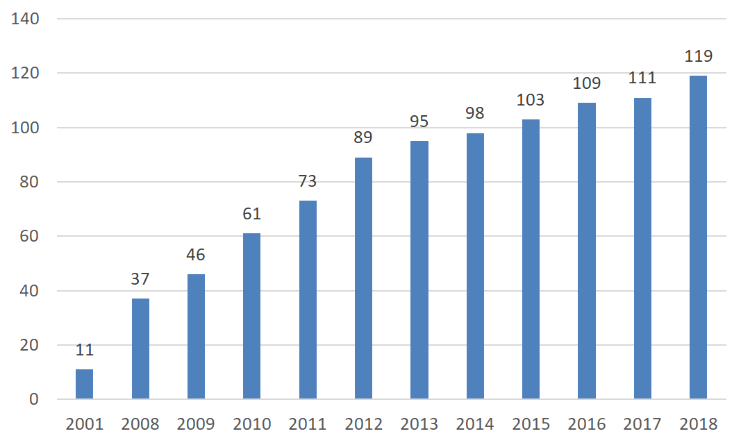 2001年以来进入《财富》世界500强的中国大陆(包括香港)企业数量。根据《财富》杂志历年数据整理。