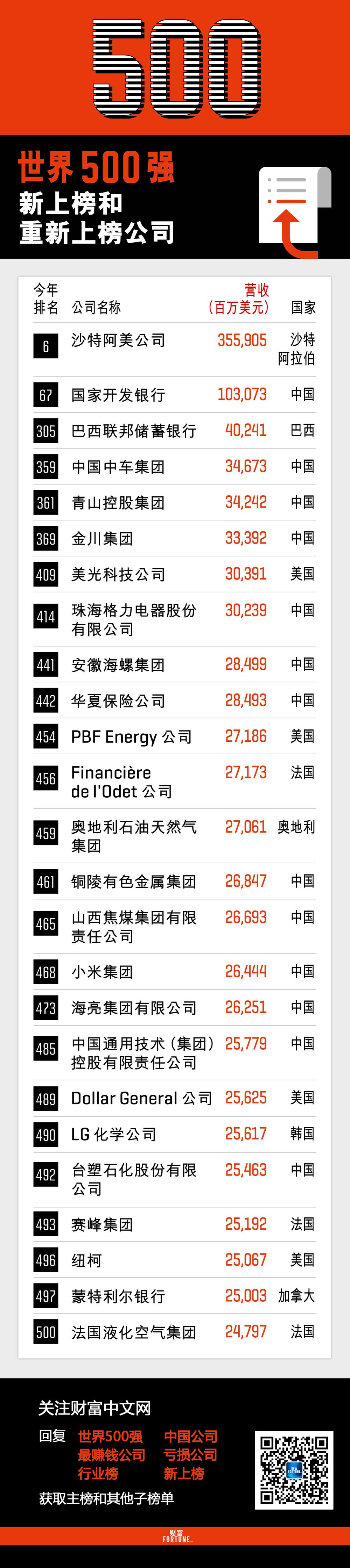 今年世界500强排行榜一共有25家新上榜和重新上榜公司,其中新上榜的中国公司有13家,占总数的一半以上。这13家首次上榜的中国公司分别是:国家开发银行、中国中车集团、青山控股集团、金川集团、珠海格力电器股份有限公司、安徽海螺集团、华夏保险公司、铜陵有色金属集团、山西焦煤集团、小米集团、海亮集团有限公司、中国通用技术(集团)控股有限责任公司、台塑石化股份有限公司。其中,受媒体和大众关注的珠海格力电器股份有限公司(第414位)和小米集团(第468位)均为首次上榜。而成立9年的小米则是2019年世界500强中最年轻的公司。