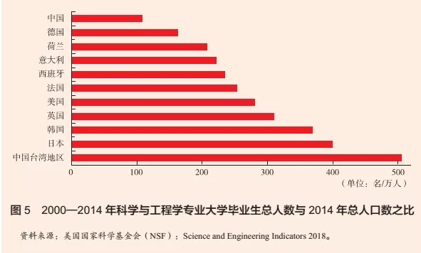 进入21世纪后,韩国、中国台湾地区培养的大量高素质科技人才,是其集成电路产业高速增长的重要基础。2000—2014 年,韩国、中国台湾地区的科学与工程学专业A大学毕业生总人数分别为187.3万人和118.4万人。按2014年年中总人口数计算,中国台湾地区每万人中就有506名2000—2014年毕业的科学与工程学专业大学生,是美国的1.8倍,日本的1.3倍;韩国每万人中有369名2000—2014年毕业的科学与工程学专业大学生,是美国的1.3倍(见